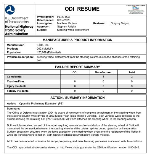 After receiving two complaints of Model Y steering wheels literally falling off while the vehicles were in motion, the National Highway Traffic Safety Administration (NHTSA) has opted to open an investigation. The regulators will narrow their focus to 120,000 Model Y vehicles of the 2023 vintage. In both cases, the NHTSA said that the vehicles were delivered with a missing retaining bolt that is supposed to fasten the steering wheel to the steering column.