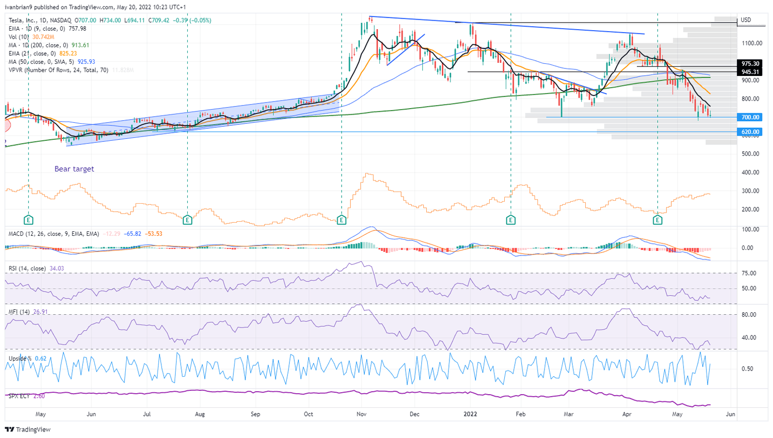 However, for now, those sticks may be getting shorter as TSLA stock has once again closed above our key $700 support. This is the key level. Friday sees a large options expiry, which coupled with position squaring ahead of the weekend should give stock markets a boost. $700 has been tested now on three occasions – the more a level is tested, the weaker it becomes. A break of $700 should see a sharp move to $620.