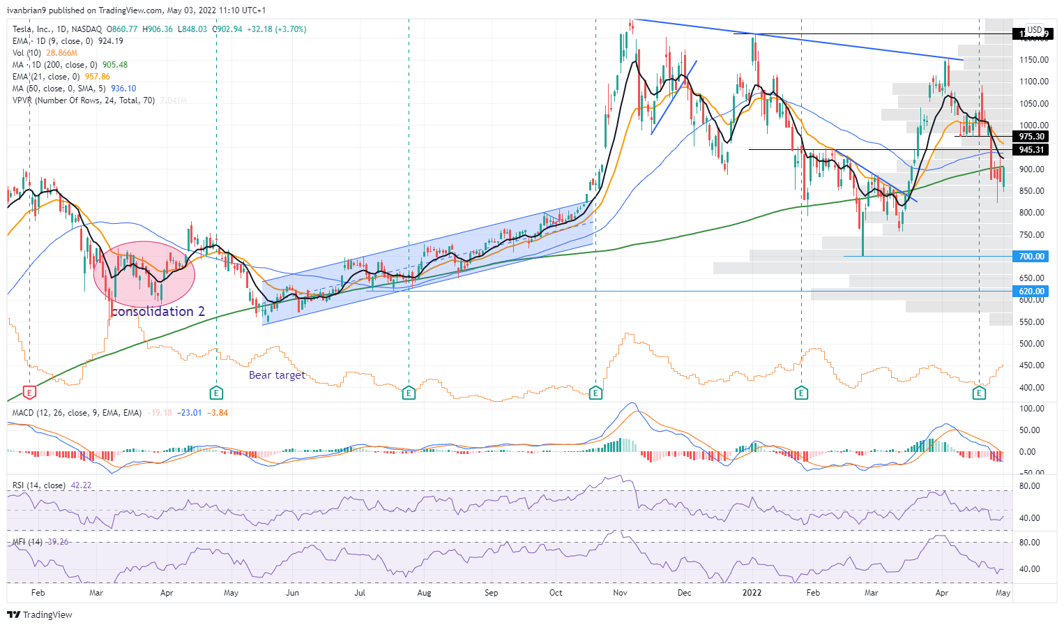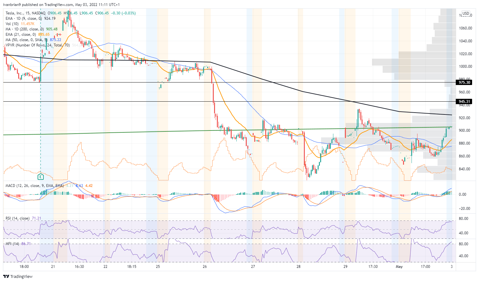 Update: TSLA stock is having an up-and-down start to the regular trading session on Tuesday, quoting almost flat at the time of this update (14.45 GMT, 75 since the Wall Street open.) Positive news crossed the wires from Shanghai, as local authorities in the Chinese economic capital helped re-opened Tesla's giga-factory after covid citywide lockdowns, while a report on billionaires pitching to Elon Musk the Twitter acquisition also has supported TSLA stock. Most equity traders are positioning ahead of tomorrow's crucial Federal Reserve meeting, with a big interest rate hike already priced in but forward guidance from Jerome Powell and the FOMC very much expected for further hints on monetary policy. Tesla, like most tech stocks, is a risk-on asset that will need some kind of dovish message to return to bullish mode.