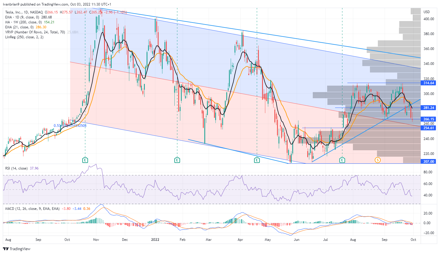 Tesla looks like it will open right on key support at $254.61. This is the series of highs from June and July that eventually gave way as global equities staged a massive bear market rally. For me, this is another key factor in a potentially imminent rally. If TSLA can hold the level, then the potential for a rally increases. Apple (AAPL) has already gotten some bad news out of the way, and these two companies are a big weighting in the SPY and for overall investor sentiment. Tesla will release earnings in two weeks on October 19. This will give more clues on how margins are faring in an inflationary environment. Overall, my view remains bearish for the long term based on falling demand and compressed margins.