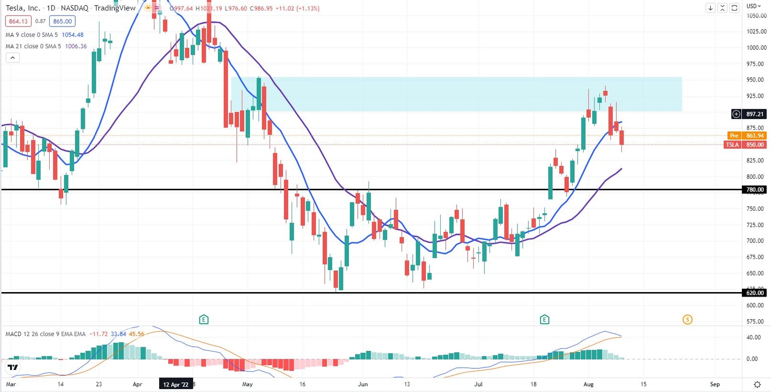 Last week TSLA stock could not break through the $900 to $955 supply zone that acted as resistance in April and May. From a chart-base perspective, TSLA stock should seek support after a failure at resistance. Unfortunately, the only support of note is at the 21-day moving average near $812. TSLA shares already broke through the 9-day moving average on Friday, August 5. Below there is the $780 level that acts as a pivot point between bullish and bearish trends. Longer-term support remains at $620.