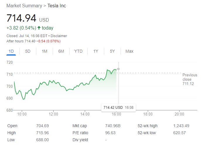 Update: Tesla (TSLA) shares were up 0.54% on Thursday and closed at $714.94. Wall Street started the day dip in the red as fears of a recession undermined demand for high-yielding assets. However, US indexes managed to bounce back after Federal Reserve Governor Christopher Waller noted that markets may have gotten ahead of themselves by pricing a 100 basis points rate hike in July, adding that a 75 bps hike will bring them to neutral. The Dow Jones Industrial Average finished the day down 142 points, while the S&P 500 lost 0.30%. The Nasdaq Composite managed to add 3 points or 0.03%.