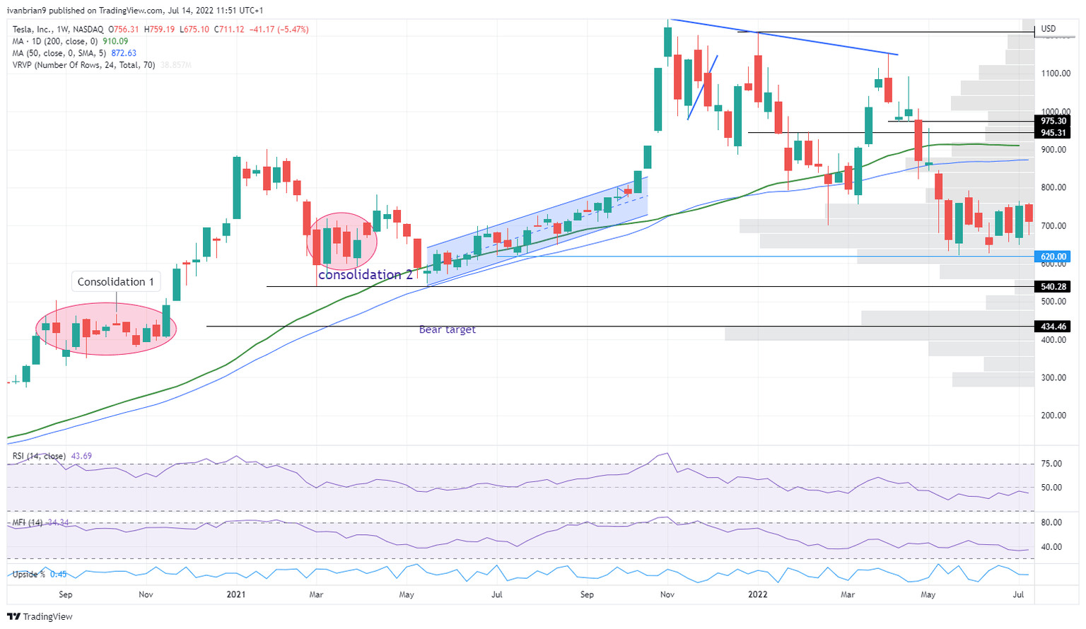 Technically, $620 remains the key level. A break there should lead to a move to $540, but there is a volume gap until $430 and things could get really ugly if $620 breaks. This current phase looks like a consolidation phase after the move lower. Consolidation phases usually result in a breakout in the direction of the preceding trend, i.e. bearish. Breaking $760 ends this and likely ends my short!