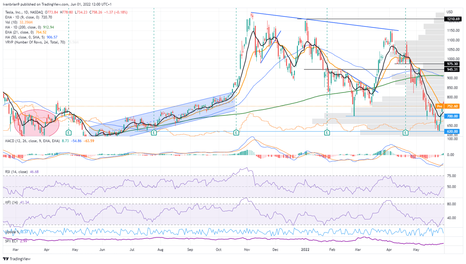 Tesla (TSLA) stock stabilized further on Tuesday after closing Friday significantly higher. The stock has been recovering ground from some heavy losses taken in the face of multiple headwinds. Tesla held the key $620 support, and this coupled with a strong recovery from the broader market enabled a move above $700. Is it sustainable though?