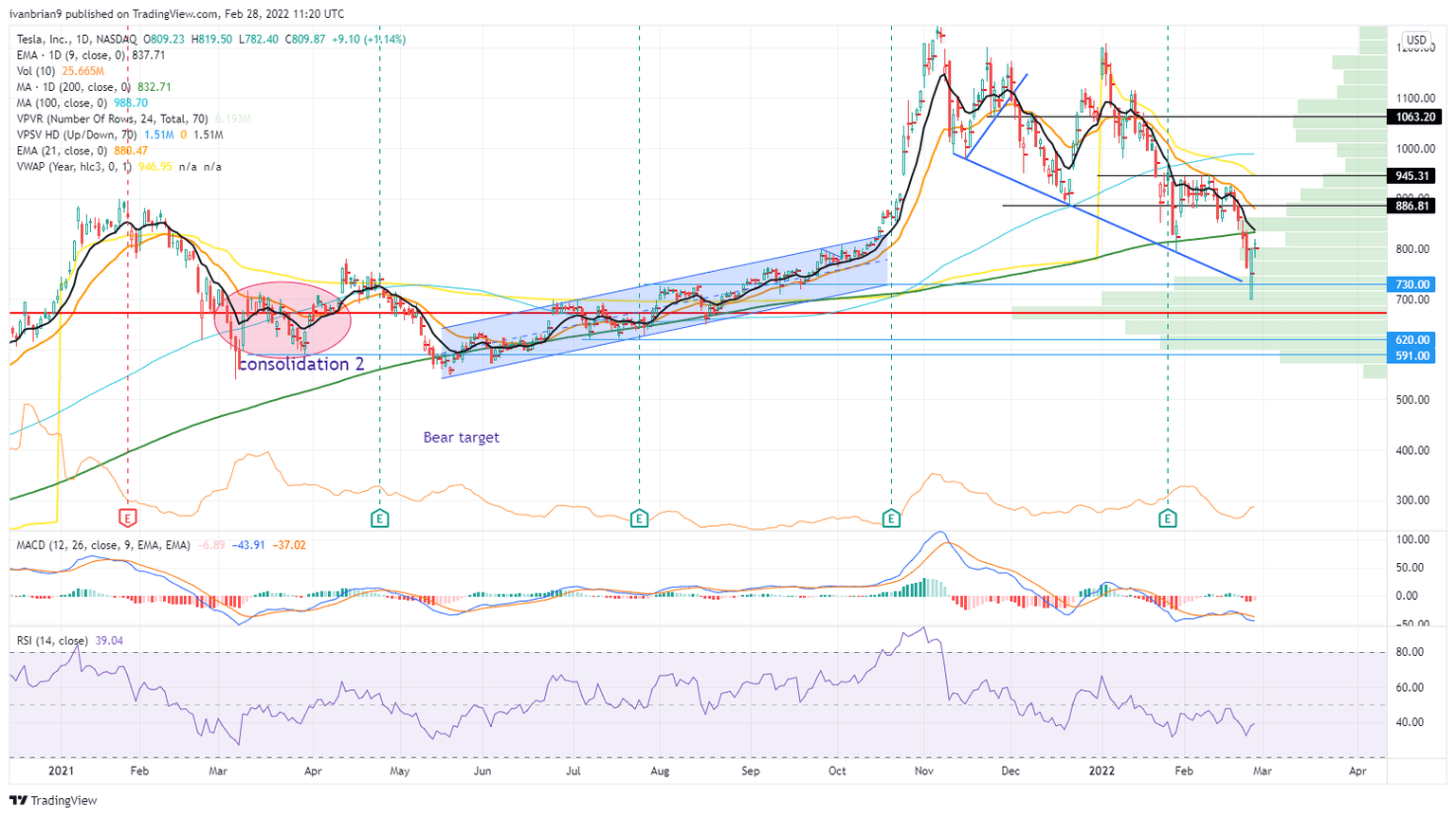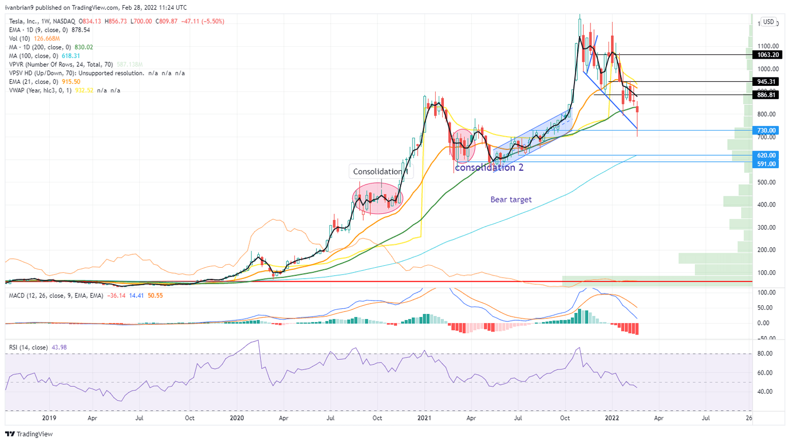 From the weekly chart, we can see breaking and holding below $730 takes Tesla back to the consolidation phase from March and April of last year. This is a neat range between $700 and $600. That may hold Tesla stock for a time, but the bears will target $400 if they can push Tesla out of the support at $600. This is the consolidation phase from September and October 2020.