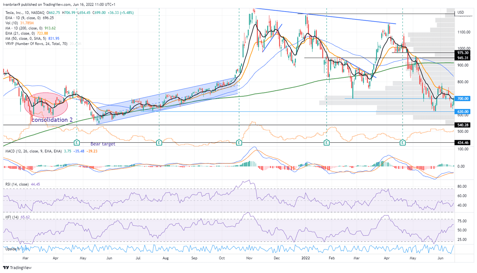 Mostly it was some relief that the Fed is waking up to the threat of inflation. This means a recession now looks more likely, but it may be short. The market is hopeful that the Fed can get things under control. Given their track record of pumping markets and then saying all inflation is transitory, we do not buy this "all hail the Fed" mantra. Regardless, the short-term reaction was a relief, and Tesla just barely failed to get above $700. Already this morning long-term investors are repositioning and selling. We expect more selling pressure before a possible month and quarter end bounce led by positive inflows.
