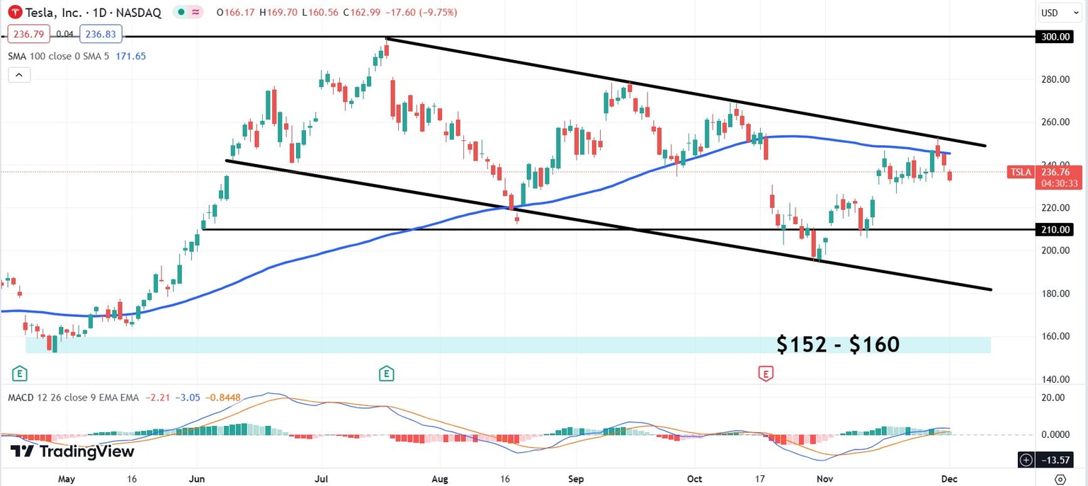 Tesla (TSLA) stock closed down 0.55% to $238.75 on Friday. This was the third day in a row on Friday that TSLA stock sold off, enacting what seems like a bearish Three Black Crows candlestick pattern, although Friday did see a rebound off a much lower open. This means that TSLA stock looks primed to drop about 10% to the $210 support level or even further to the descending bottom line of the price channel in the $180s as the market moves toward Christmas.