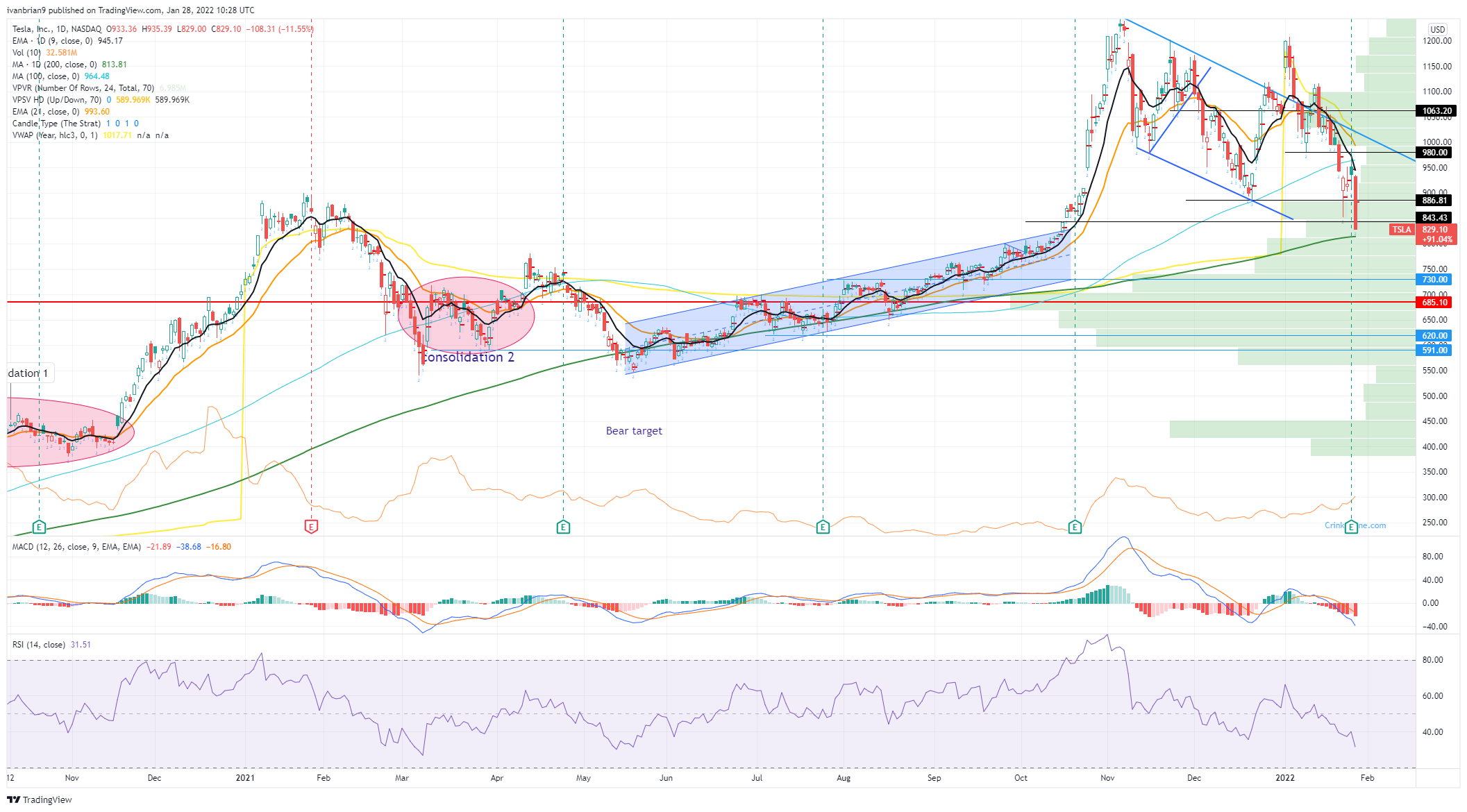 UPDATE: Tesla shares fell 2.9% to $805 15 minutes after the open on Friday. This places the stock below the always significant 200-day moving average at $814, which could make $730 the new downside target. This comes a day after the EV leader plunged 11%. All three major indices are down, and the tech-heavy NASDAQ has lost 0.3%.