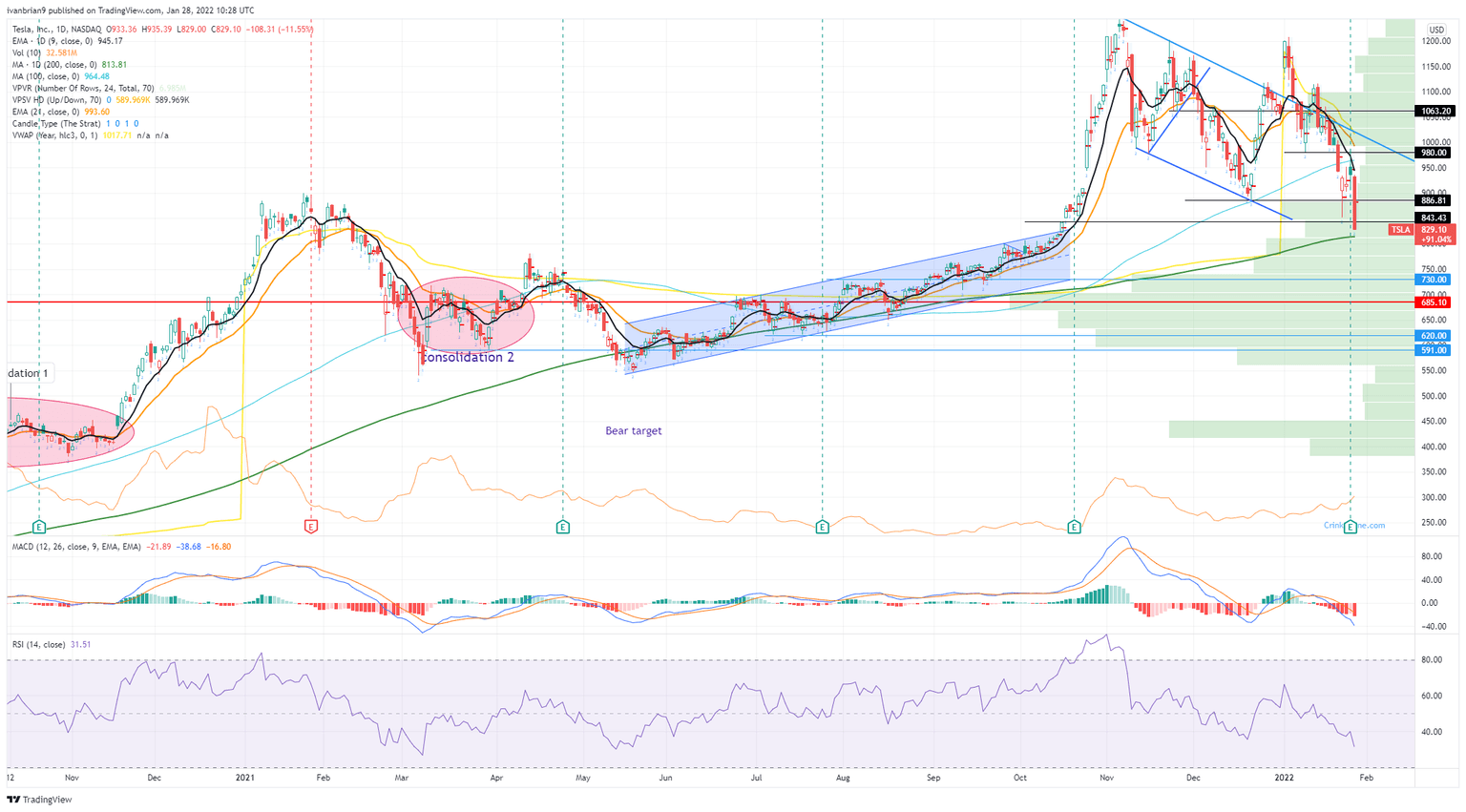 Tesla approached key support from the 200-day moving average at $814. This is a key level for all stocks, and Tesla has not been below it since August of last year. A break and it is on to $730 as the next major support. $685 is the point of control and a huge volume profile support.