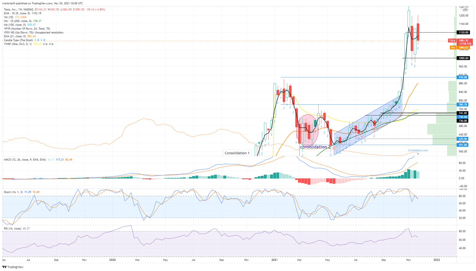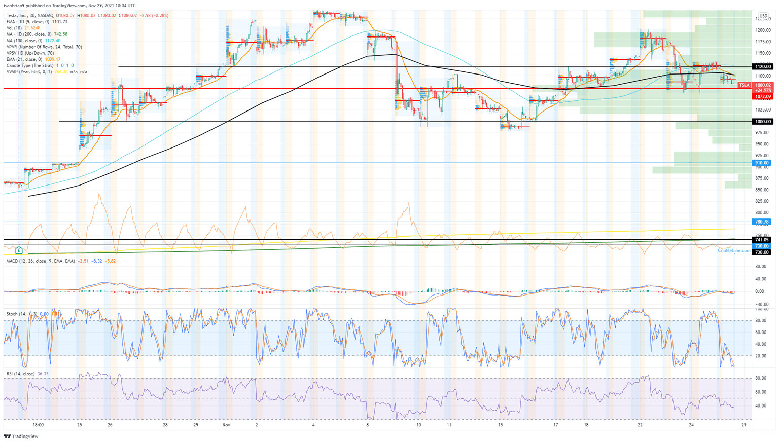 Tesla (TSLA) stock fell by over 3% on Friday in a combination of panic selling as a new covid variant appears to be sweeping the world and a general lack of liquidity due to Thanksgiving festivities. We are now officially in the festive season and it remains to be seen whether we get the much anticipated Christmas rally. Equity markets were heavily spooked late last week as the new covid variant was discovered in South Africa. This led to oil suffering one of its largest one-day falls ever and stocks going into freefall. Tesla fell over 3% in what, by comparison with some other names, was not as bad as feared. The stock remains strong but if profit-taking hits ahead of year-end there could be more falls in store for the electric vehicle leader.