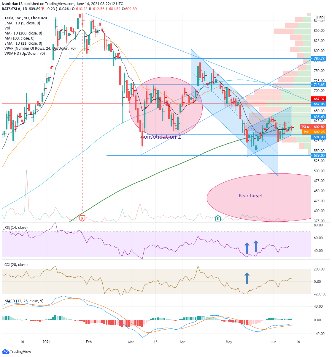 Tesla (TSLA) shares continue their momentum but look to be at least stabilizing following recent losses and potentially looking at a break higher. Tesla has been under pressure since results in late April and even before. The meteoric rise of the stock in 2020 obviously has something to do with that as nothing can keep going up forever. The entry of Tesla into the S&P 500 has also meant the shares becoming more arbitraged versus other stocks, indices, etc. Witness the huge option gamma squeezes in GameStop (GME) and AMC this year. This was also a feature of Tesla in 2020. Once in the S&P 500, it is much easier for a market maker to hedge his position as Tesla is part of a large futures and options complex. Large option buying will push the value of a Tesla option slightly out of line, but arbitrage algorithms will quickly move it back into line by performing a highly complicated set of hedging techniques using multiple derivative products across the S&P 500 landscape.
