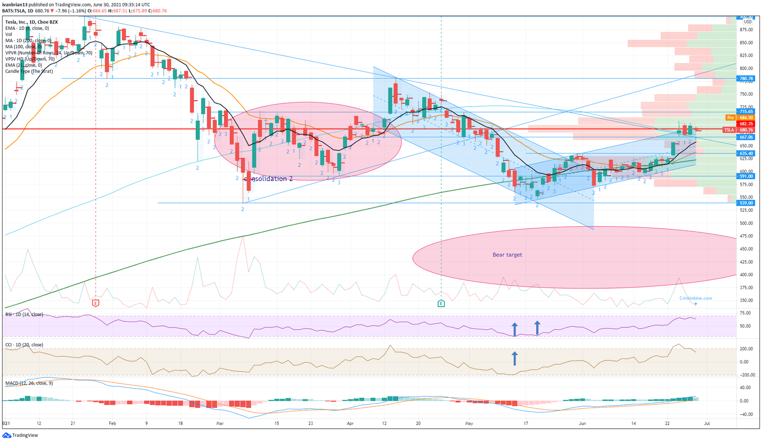 Update after the close: Really we have been calling this one so well we should be lazying on a boat in the Caribbean, socially distant of course! Tesla stock reacted negatively to higher levels on Wednesday as an initial 1% gain was short-lived. TSLA closed just slightly lower at $679.70. This consolidation is exactly what we had predicted after the explosion though $635 (which we also predicted, ahem!). Given the decent volume from $670-715 the move was more likely to slow. This volume profile does not thin out until the stock gets above $715.