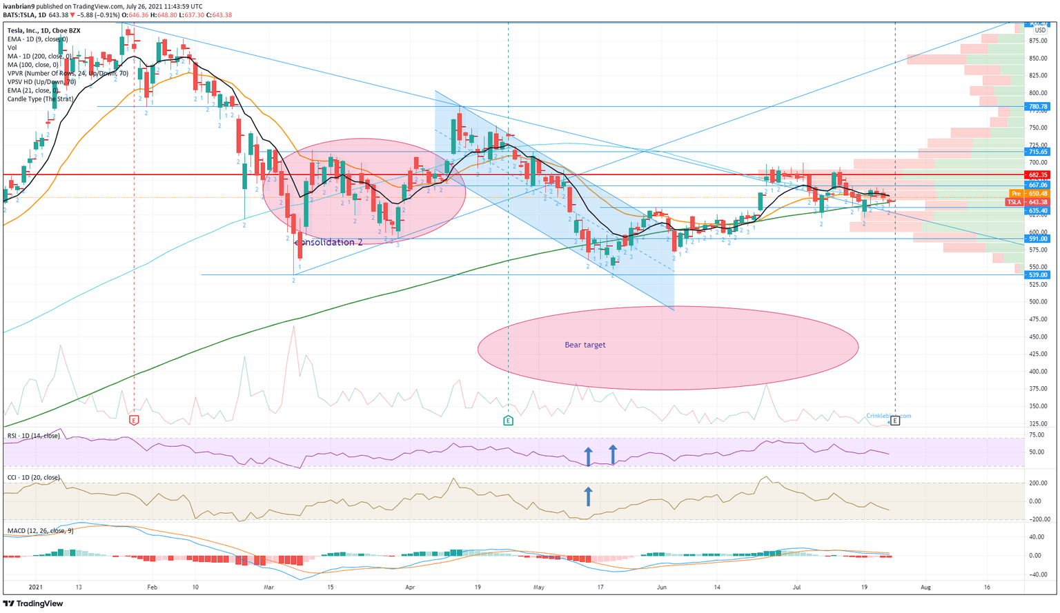 Tesla has been holding steady around the 200-day moving average since the middle of June when the strong uptrend broke down. The move through $635 and $667 key resistance levels had been accurately called here at FXStreet, and the volume profile contributed to some strong moves and strong profits for those following the break. As we had also identified, the area from $690 to 715 was always likely to see Tesla stock get stuck in traffic (easy pun) as there was a lot of volume here. $715 was the next big resistance and the failure to break through here and even the psychological $700 level has seen largely directionless sideways trading. The 9 and 21-day moving averages show us this clearly with both flatlining. Hopefully, the results after the close today will at least give us a trend to follow for the next opportunities.