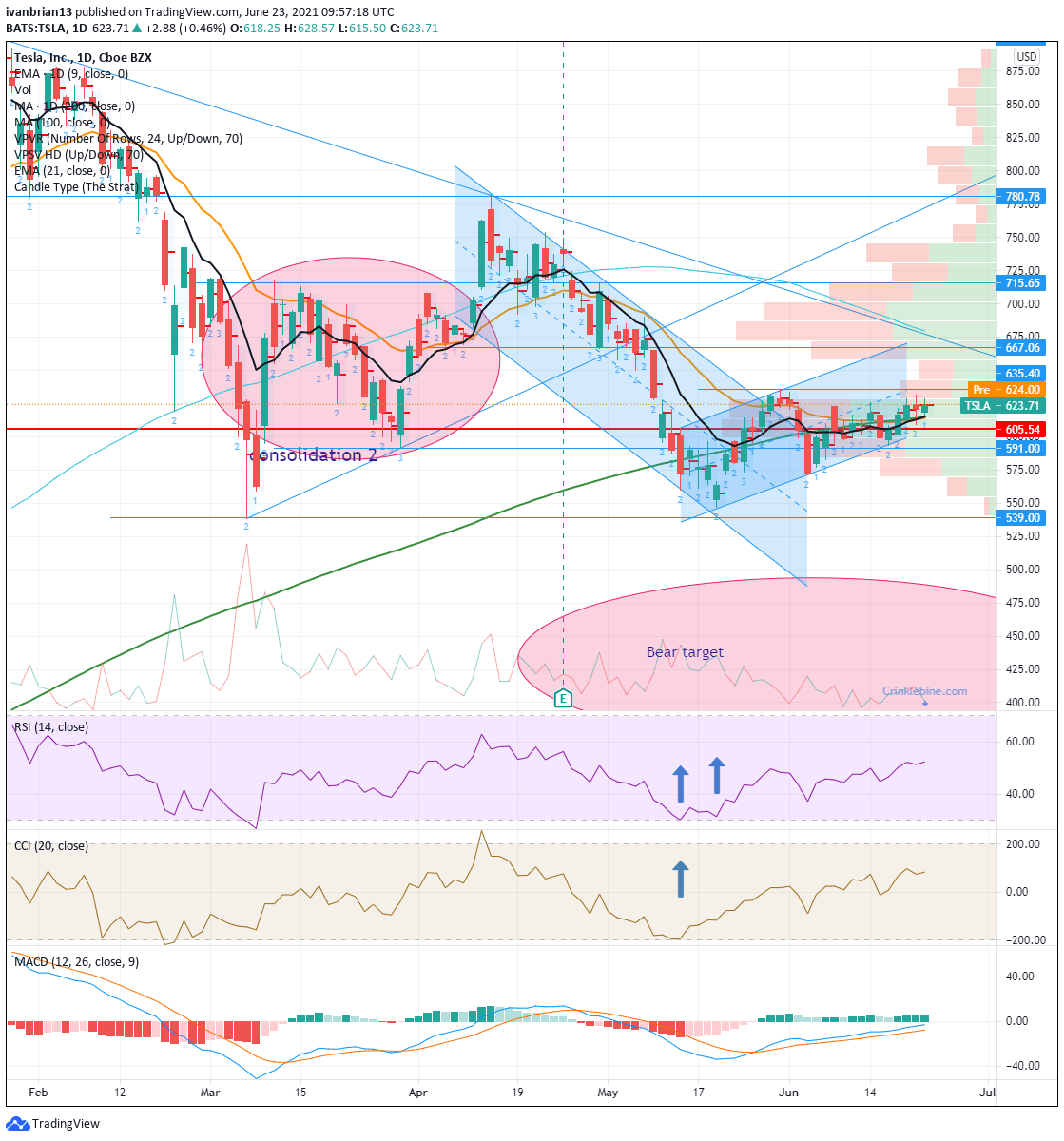 Update June 24: TSLA stock rallied hard on Wednesday after a powerful breach of the $635 critical resistance. Tesla shares jumped over 5% to reach the highest levels in six weeks at $657.12. In post-market trading, the stock added another 1% to finish at $663.30. The technical breakout was one of the key catalysts behind the price surge. The latest news that Tesla launched its first charging station in China with an energy storage function for electric vehicles triggered the blistering rally.