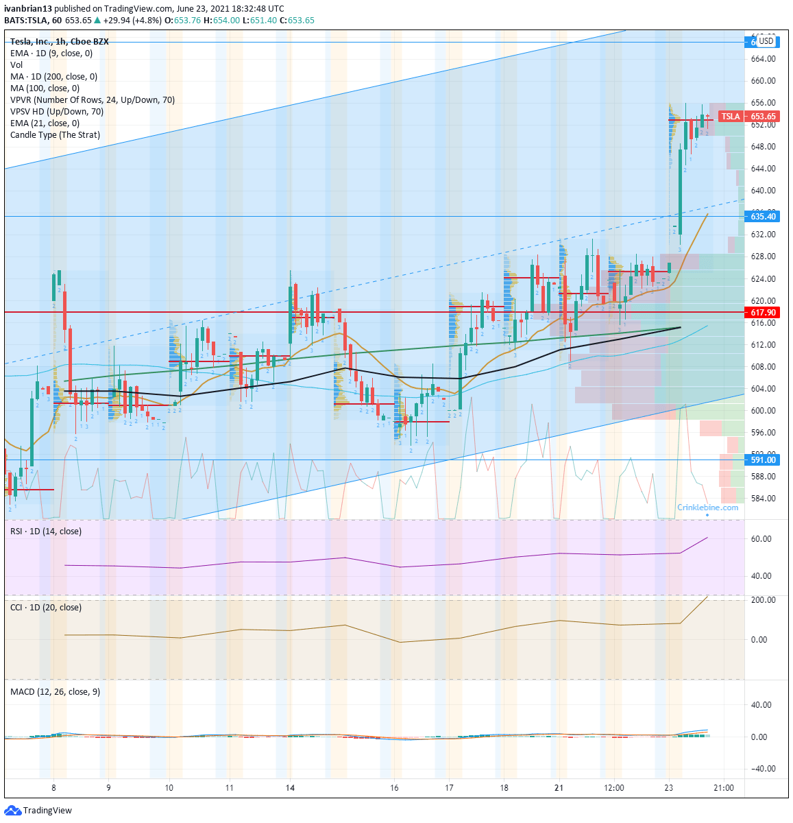 Update: The early powerful break which we called (see below) has been sustained and the stock looks set to register a powerful bullish candle. At the time of writing with just over one hour left in the regular session TSLA stock is trading at $653.85 up nearly 5%. The hourly chart below shows just how thin volume was (red/green bars on the right of the chart) above $635 which was also the May 28 high, so a key level.