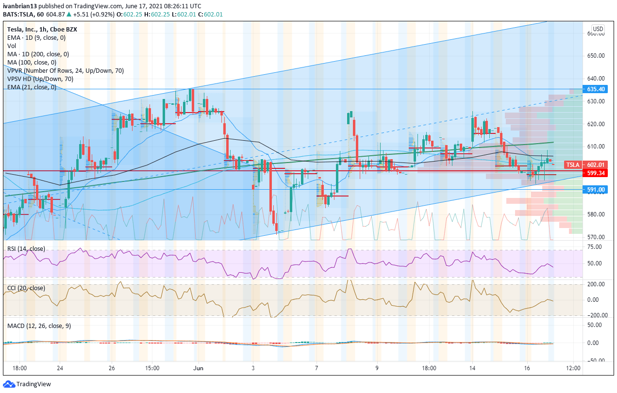 Update June 17: After overcoming the surprisingly hawkish Fed decision, Tesla Inc (NASDAQ: TSLA) has been extending its gains on Thursday, this time rising along with broader stock markets. Shares of Elon Musk's electric vehicle maker are buoyed by the recent presentation of a new model and by growing investment in the sector. Maintaining a safe distance from the round $600 level opens the door to $635, as explained in-depth below.
