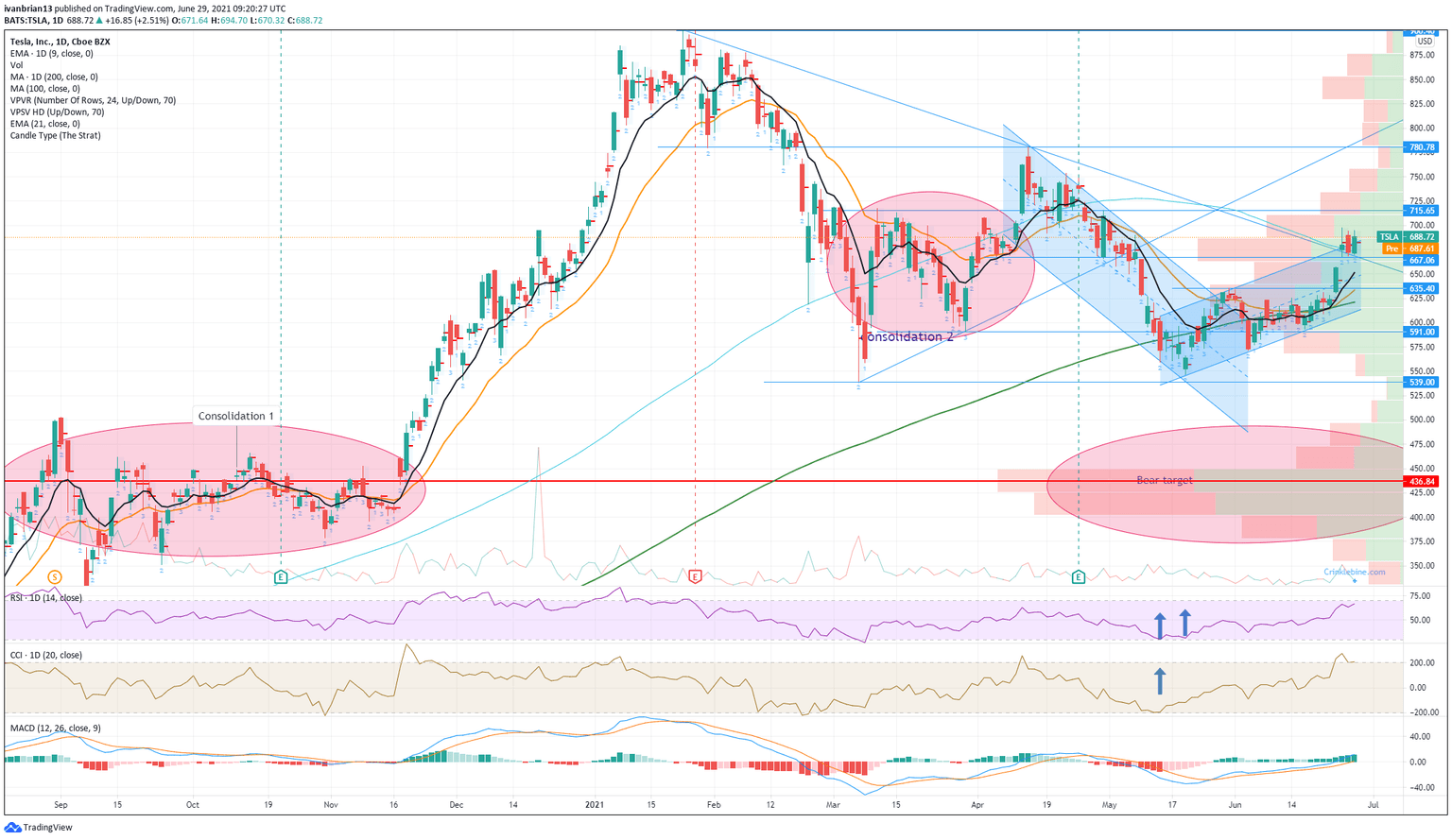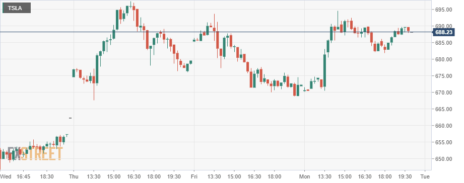 Wednesday was when the move really kicked off technically. $635 had been a key level we had identified here at FXStreet as the volume profile was thin above this price. All this should have resulted in a price acceleration and this played out perfectly as Tesla stock powered through the level. $667 was the next resistance, and this corresponded with the wedge formation Tesla stock has been in since record highs from January. Tesla again did not disappoint and charged through the level. Friday saw some consolidation and profit-taking, but Monday's strong performance has kept bulls right on track and reenergized or charged them up.