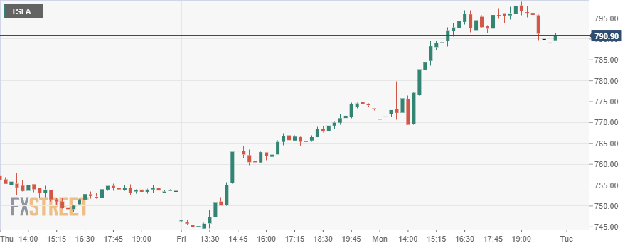 Tesla (TSLA) stock continues to drive higher and break key levels in the process. Thankfully, FXStreet has been guiding you higher along with the stock price and has seen some key technical levels serve their expected role and volume gaps working exactly as they are supposed to. Monday saw a particularly strong performance from Tesla as the overall market was lower and tech and Nasdaq stocks took a bath due to higher yields. Tesla stock though surged ahead by over 2% to close above the big $780 resistance at $791.36. This set a new high not seen since the middle of February this year.