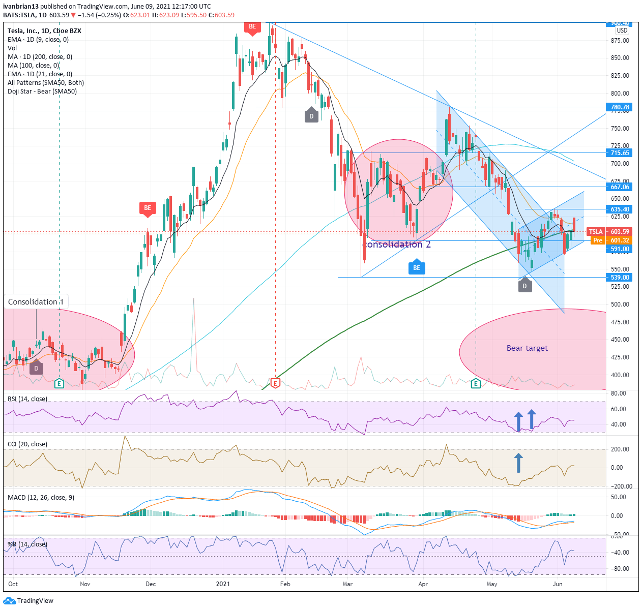 The first resistance target is at $635.40, the late May high. $655 above that is the top of the relatively formative uptrend channel. $667 is the real prize bulls seek as this would end the series of lower highs and lows. $539 is key for bears as a break is likely to accelerate a move below $500. There is little price discovery from $539 to $465 as shown by the Consolidation 1 area. Tesla moved sharply out of this zone late in 2020.