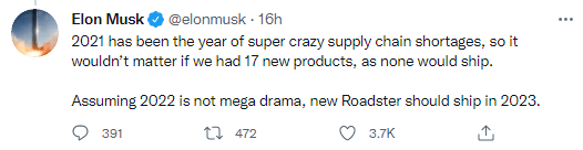 This tweet came out at 1810 GMT/1410 EST, and an hour later the Tesla stock price crumbled as we can see from the 5-minute chart above. This may or may not have been the reason, but it does seem like a plausible explanation. News that Tesla had to halt production in China for four days last month, also due to chip issues, added to the woes. Premarket signs on Thursday are not good with further selling pushing Tesla down to $729. The Roadster shipping in 2023 represents a delay of approximately a year, so it is a pretty big disappointment.