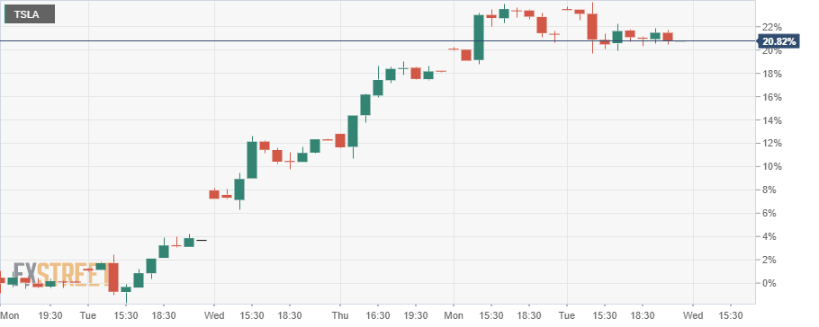 Update: TSLA resumed its advance on Wednesday, up a modest 0.14% heading into Wall Street's close and hovering around $1,090 per share. Wall Street offered a better tone, with most indexes holding in the green for most of the session. The worst performer was the Nasdaq Composite, currently down 2 points. Speculative interest is so far ignoring news reporting record coronavirus contagions in the US and Europe. However, if the situation persists, it may end up with stricter restrictive measures, which in turn, will hit the economic recovery.