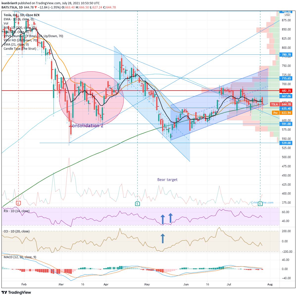 Tesla stock closed nearly 2% lower on Tuesday despite posting strong earnings after the close on Monday. Earnings were strong with a beat on the top and bottom lines. Adjusted earnings per share (EPS) came in at $1.45 versus the estimate from Wall Street analysts for $0.96. Sales came in at $11.96 billion, also beating the $11.21 billion estimate. Delivery numbers were also high on investors' minds, and these too were ahead of estimates. Tesla delivered 201,304 vehicles in Q2 2021 an increase of 121% over the same period last year. Tesla said its average selling price had declined by 2% over the year, but its gross margin increased three percentage points from 25.4% to 28.4%. Tesla stock popped just after the release of results, but the regular session on Tuesday was not so kind with Tesla stock closing at $644.78 for a loss of 2%.