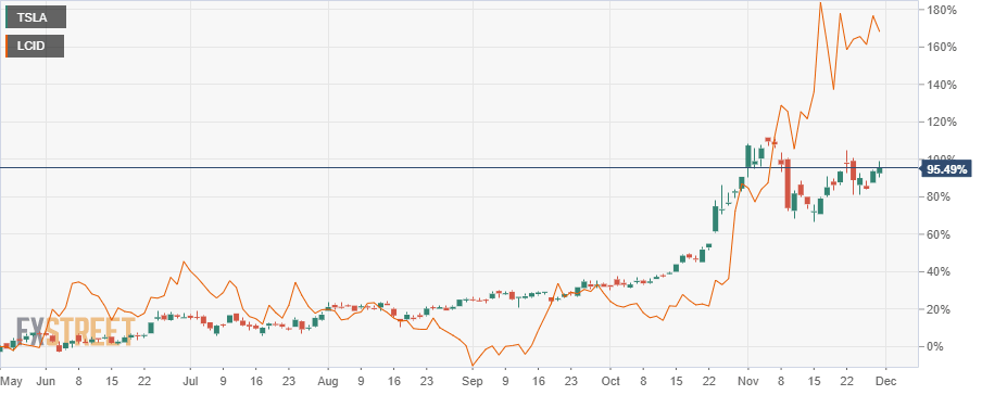 Our chart above shows the strong correlation between Tesla and Lucid with both stocks putting in a stellar second half for 2021.
