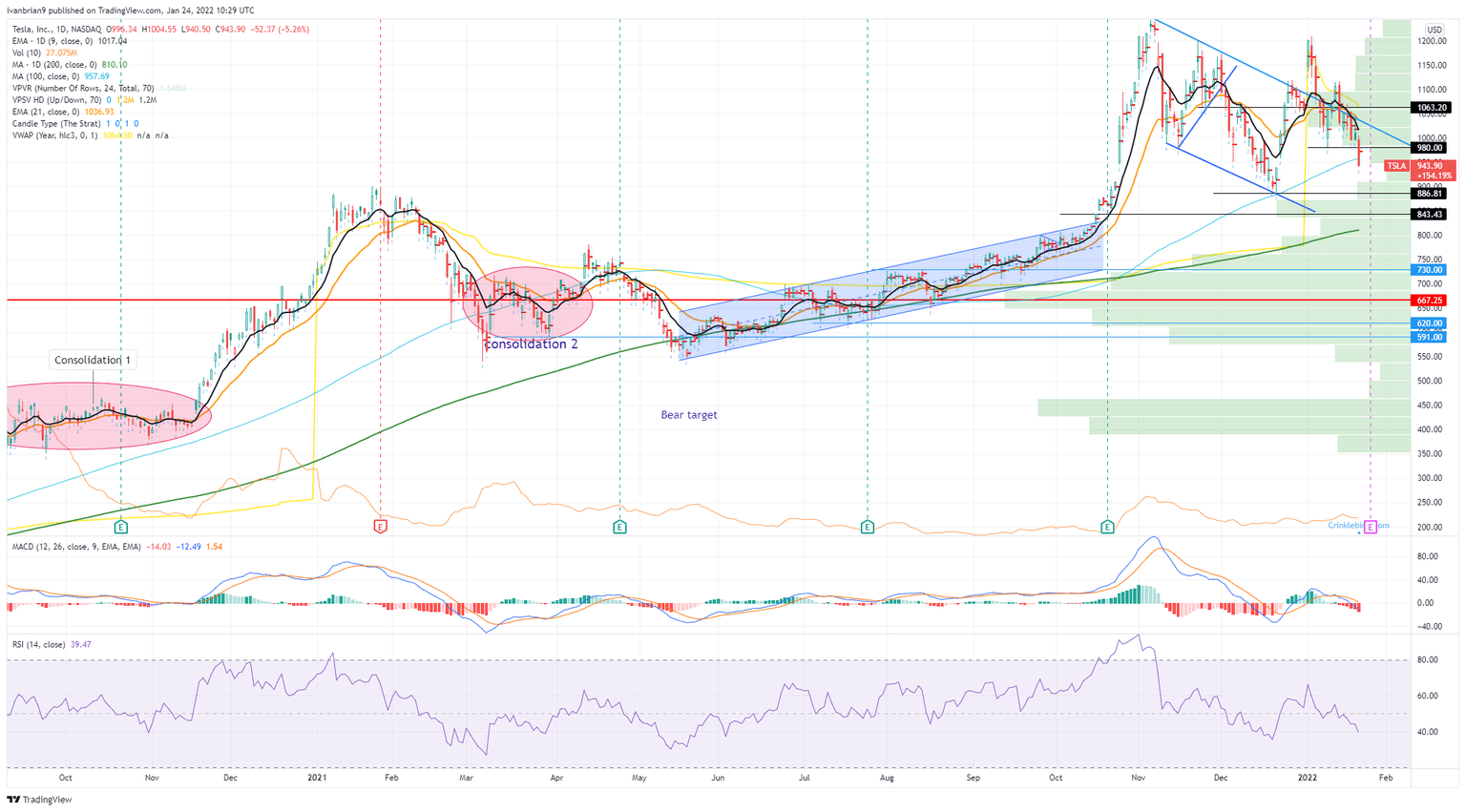 Tesla (TSLA) finally broke below $980 on Friday in a day of heavy losses for the electric vehicle leader. Growth stocks continue to suffer, and Friday saw perhaps an acceleration of that trend. Risk aversion is growing ahead of the first rate hike, while geopolitical tensions are also not helping risk appetites as the Russia-Ukraine situation continues.