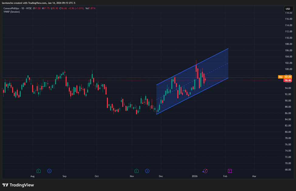 As a bit of background, COP has been actively trading within this defined range since late November, and the current move higher is still occurring within that same technical framework. The stock’s recent performance, including yesterday’s green session and the broader bounce from the November 25th lows, is precisely what makes this pattern so important to monitor. The trend may appear constructive on the surface, but the structure itself is what ultimately matters.
