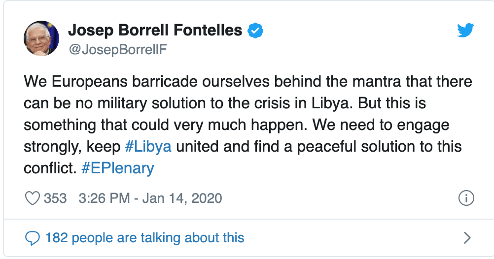 During the Berlin Libya conference, there are also lots of bilateral meetings. Josep Borrell Fontelles, High Representative of the Union for Foreign Affairs and Security Policy and Vice-President of the European Commission meets Mike Pompeo, United States Secretary of State. A senior State Department official said that Secretary of State Mike Pompeo would urge three things: the continuation of a cease-fire; the withdrawal of all external forces; and a return to a Libyan-led political process facilitated by the United Nations.