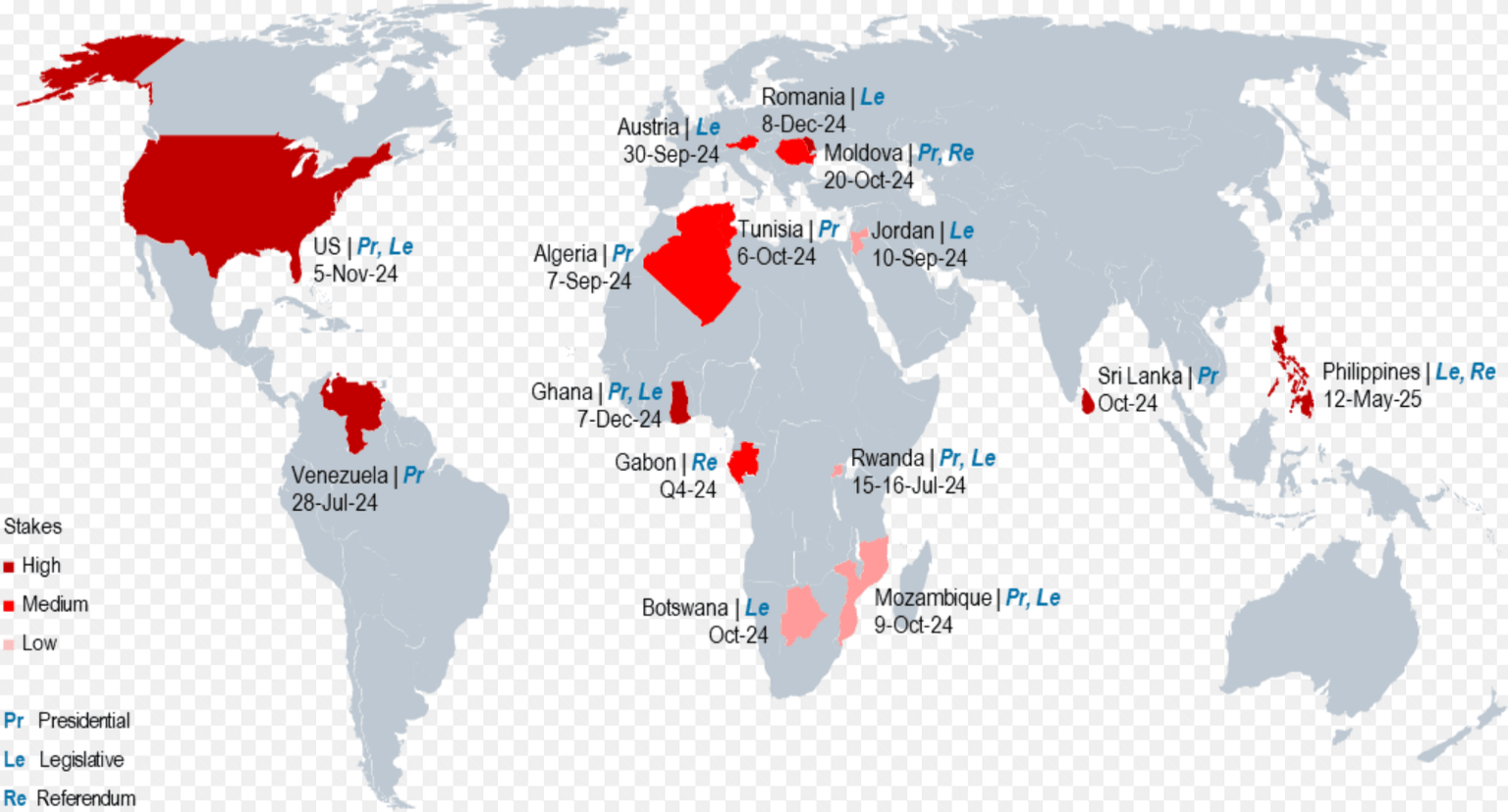 “’High-stakes’ elections – which we define as having an uncertain outcome, significant political (and in some cases geopolitical) implications, and/or the potential to move markets – will take place in Venezuela, Moldova, Sri Lanka, Ghana and the Philippines, as well as the US. In many cases, a confluence of populist movements and economic and political tensions is raising the election stakes.”