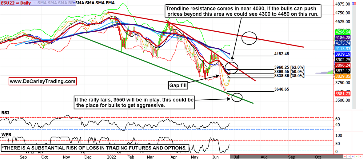 Stock market bear markets are difficult to manage. Unlike uptrends, downtrends are violent. New lows are accompanied by massive bear market bounces capable of making the bears question their existence. While we are optimists at heart and we recognize bullish seasonal tendencies in the coming weeks, the chart suggests the uptrend will struggle to break 4030 (assuming it is seen). Further, our longer-term chart work is still calling for a high likelihood of a 3550ish print, but if seen that could be the place for bulls to get aggressive.