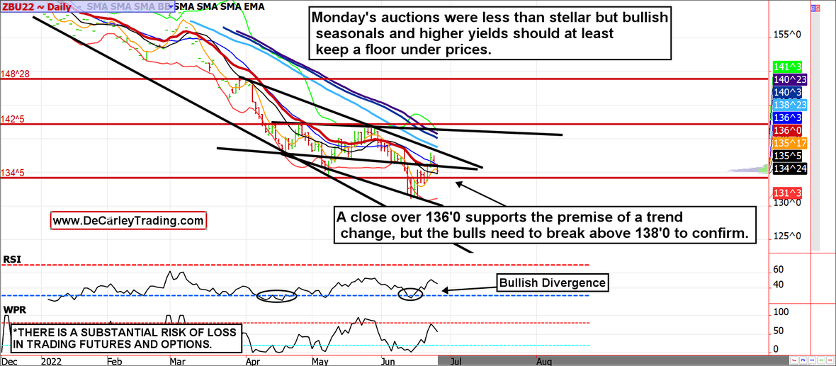 A close over 136'0 in the September 30-year is needed to keep the bulls in the game. A break above 138'0 confirms a trend change.