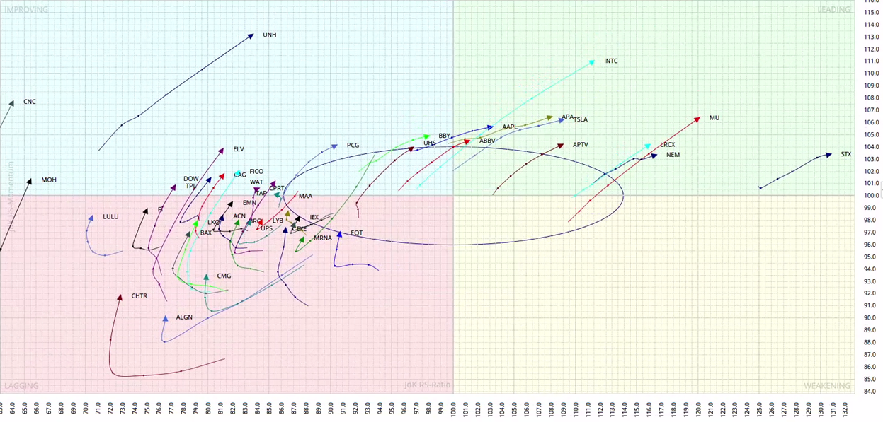 However, while many of these companies could continue to experience growth and high relative strength (RS) that persists over time, it’s actually better to find stocks that are pointing “northeast” and coming out of the lagging quadrant.