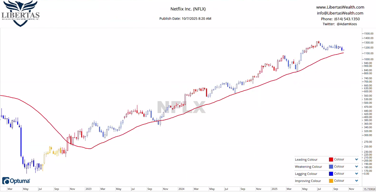 Finally, watch as Netflix continues to trend northward, crossing below its 40wMA only once (in October ’23), but also crossing back and forth between the weakening and leading quadrants over and over again, maintaining its uptrend along the way.