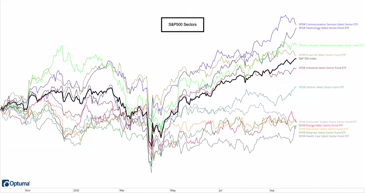 Next-in-line is the index itself, followed by industrials and then the defensive sectors in utilities, real estate, and consumer staples.