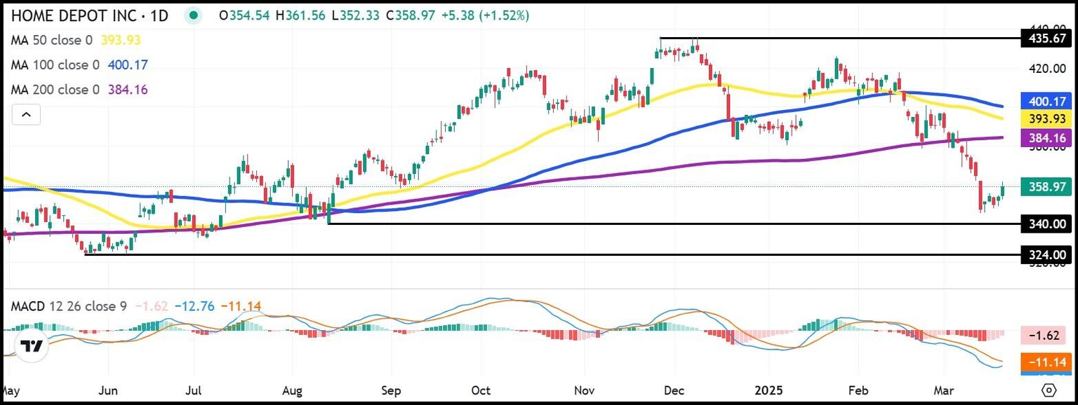 HD stock needs to overtake the $384 level in order to contain the recent fallout. That, however, is unlikely to happen unless the US administration discards its current pro-tariff trajectory.