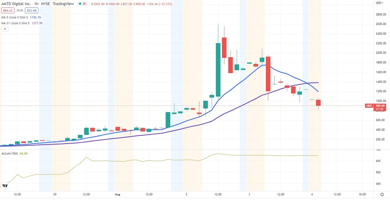 The sheen may finally have fallen off for AMTD Digital (HKD), the Hong Kong investment company that was worth more than Walmart (WMT) just two days ago. Shares are currently down 25% at $825 in the first half hour on Thursday. This comes a day after HKD stock sold off 34.5% to end the day at $1,100 on Wednesday. This puts HKD stock 68% off its all-time high of $2,589 on August 2.