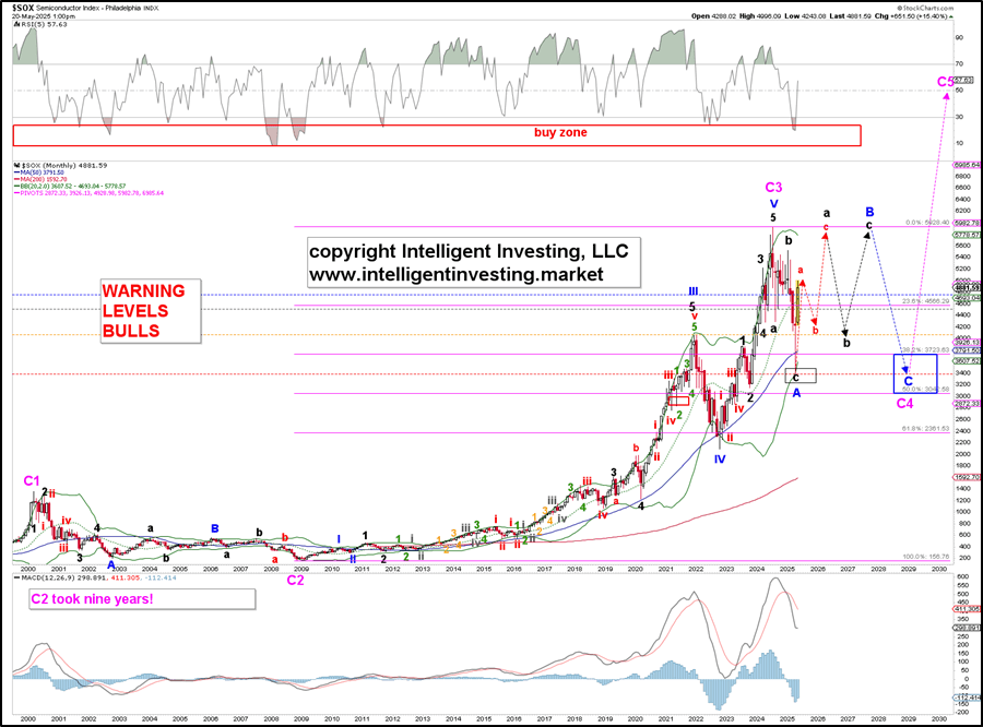 With the added price data, we can provide a more detailed update on our overall EW count for the SOX, which currently places the index in a Cycle-4 wave. See Figure 2 below. Fourth waves are typically described in EW terminology as flat corrections. Furthermore, EW theory includes a rule of alternation: Wave 4 differs from Wave 2. In this context, Cycle W-2 was an extended nine-year zigzag; therefore, Cycle W-4 is expected to be a multi-year flat.