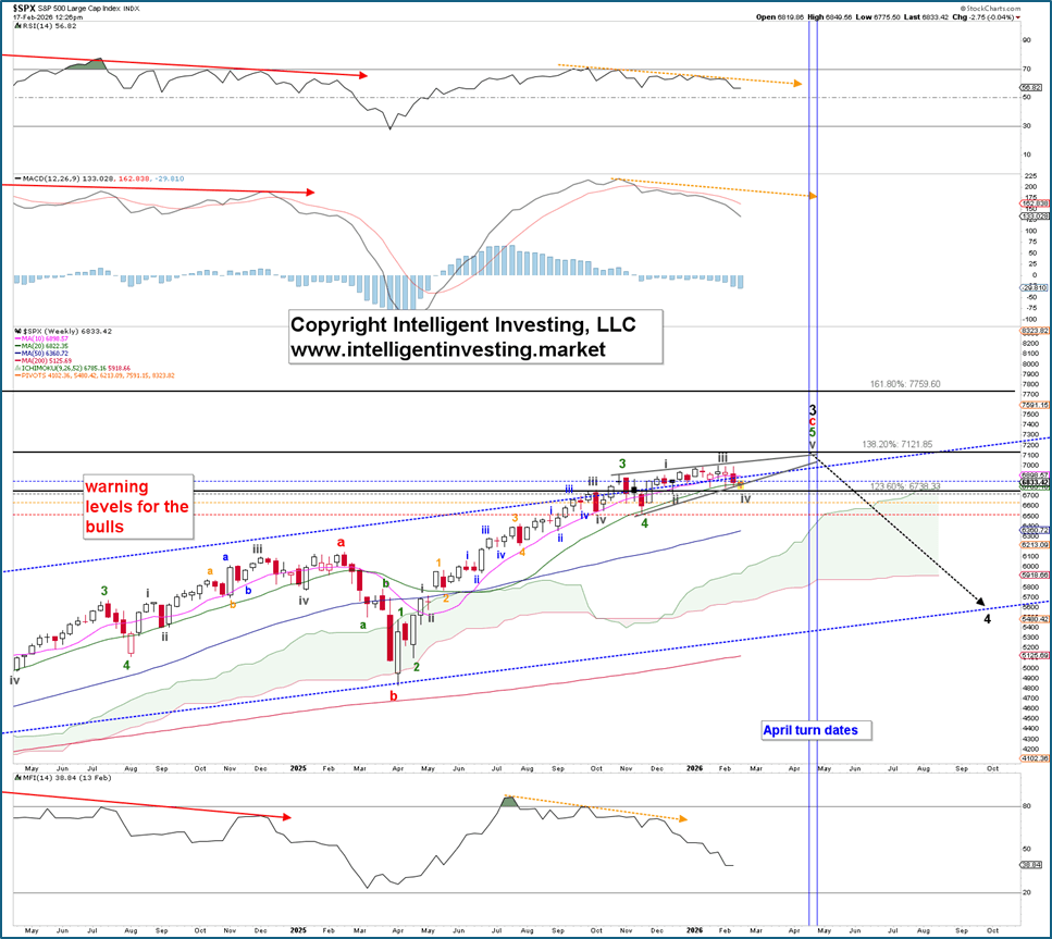 Thus, if the Bulls can at least hold 6780, our third warning level, which equates to a 60% chance that the uptrend is over on a daily close below it, we can allow for that last gray W-v to ideally 7120-7190 to take hold into the April turn date window (see also here). If they can’t, we'll watch for the 6575 level.