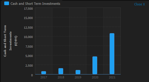 One unusual stock to put in an article about dividends does not pay any dividends. Bear with me, I have not lost my marbles. Moderna (MRNA) has piles of cash after the pandemic, and it will look to do something with it. Looking at our chart below, we can see that Moderna has about $11 billion dollars in cash and debt of $600 million. Basically, it is sitting on $11 billion of cash.