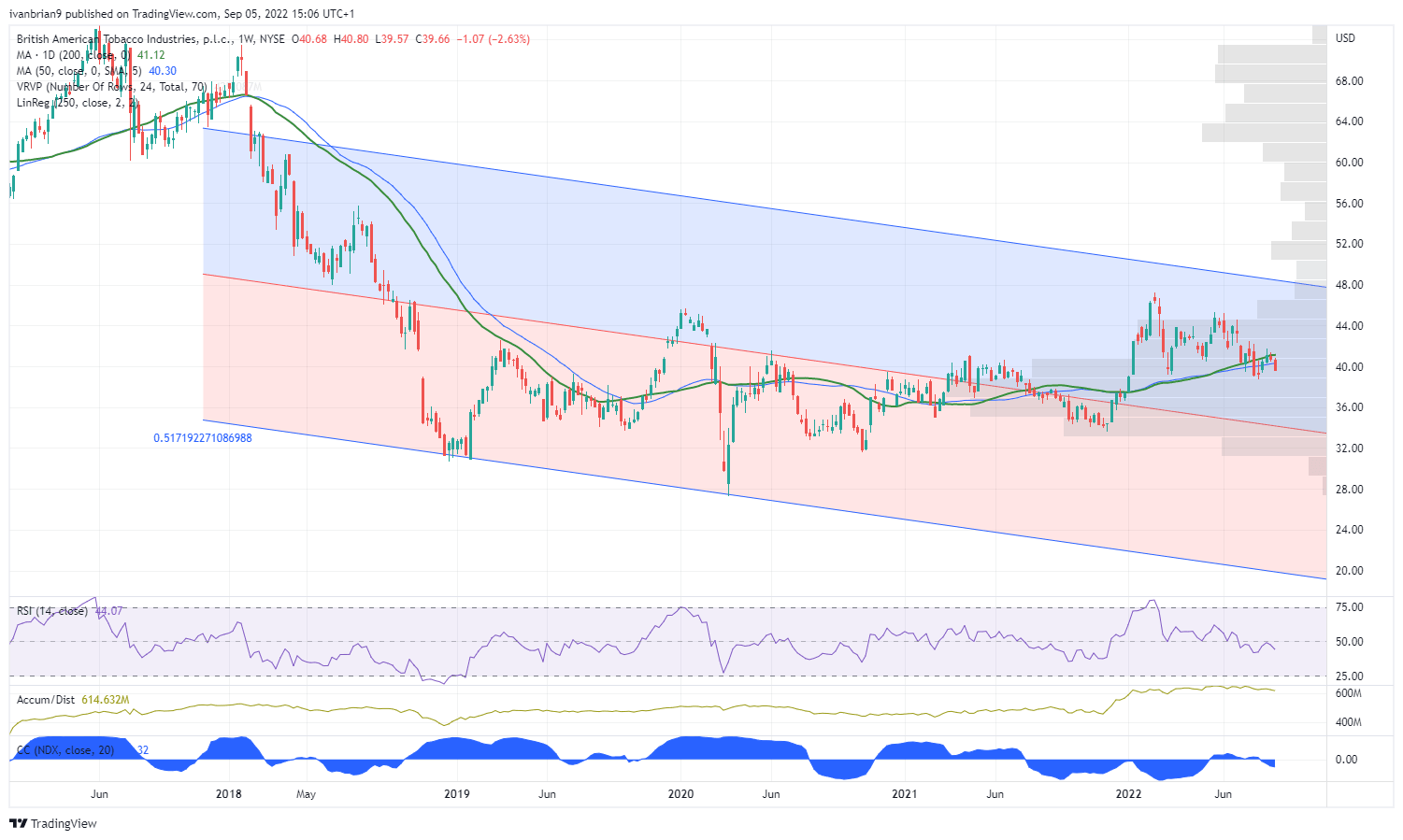 BTI has retraced to its 200-week moving average, and despite recent price falls we still see a rising accumulation/distribution line. This would indicate buying power holding constant.