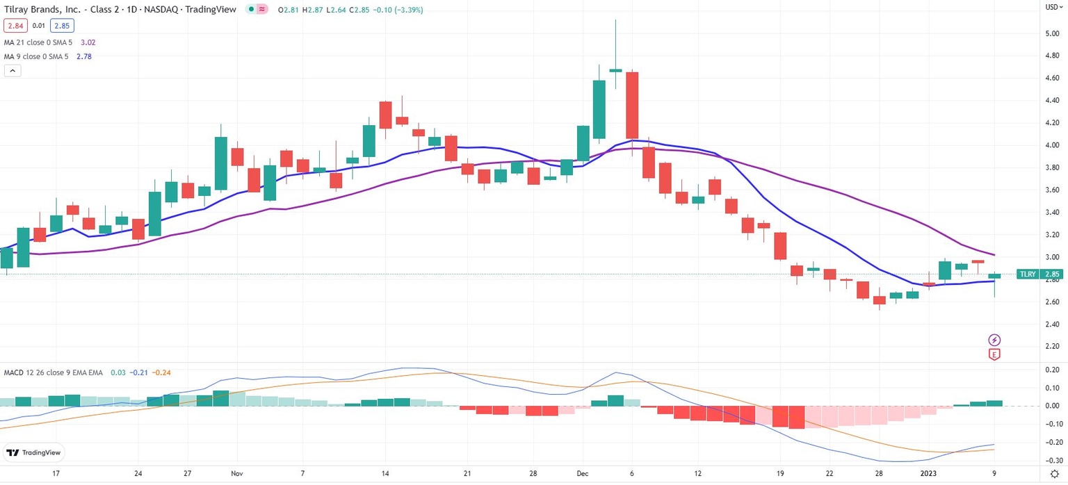 - Tilray share price climbs back above 9-day moving average.