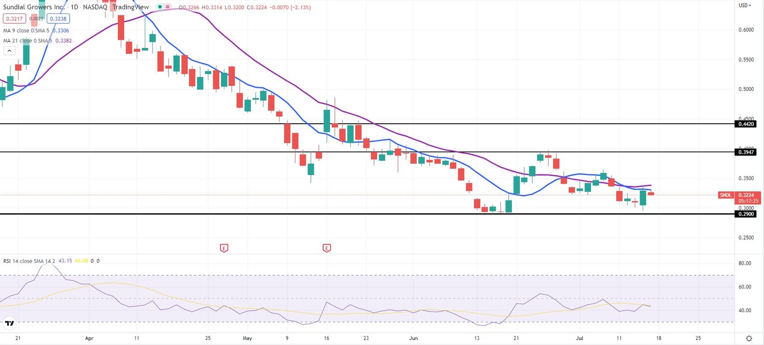 Sundial stock faded from its range high near $0.3947 at the end of June and has mostly been collapsing since. That resistance level guards the May target of $0.4420. Bulls better hope that $0.29 holds, the most recent support. If it does not, then expect SNDL stock to trend down to between $0.20 and $0.25.