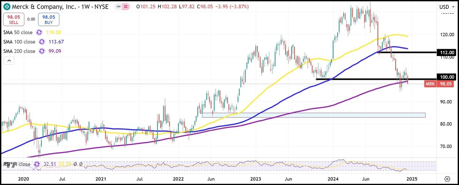 Merck (MRK) is another healthcare stock, this time a pharmaceutical name, that should benefit in 2025. Shares of the New Jersey-based company have fallen from the $130s to below $100 late this year, but the headwinds look overblown.
