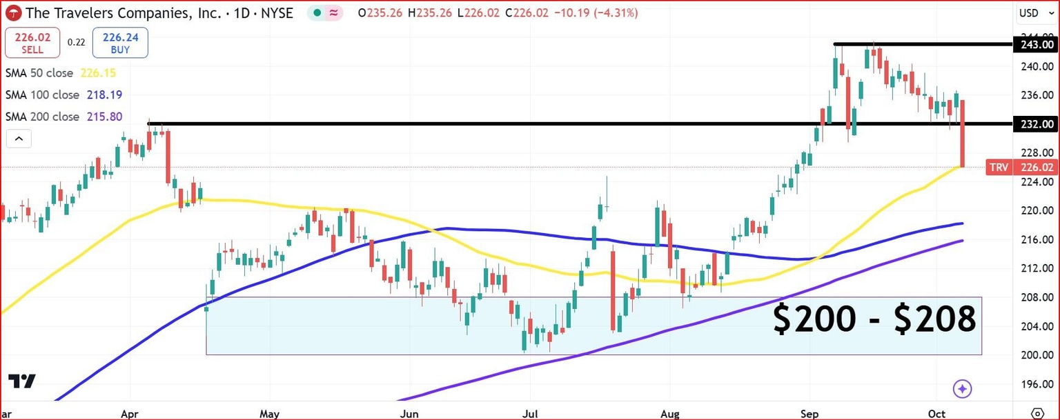 TRV stock is already sitting near the 50-day Simple Moving Average (SMA) at $226. This is well off its recent all-time high of $243.48 on September 17. The current pullback that has been taking place over the past three weeks has dropped below April's resistance at $232.