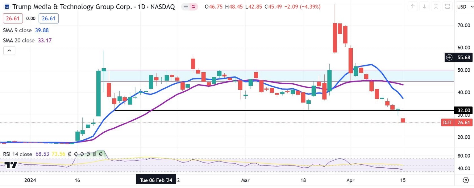 Trump Media stock broke directly through the $32 support level without noticing on Monday. This was somewhat surprising since bulls had rushed in late Friday to help DJT close above $32 late in the session.