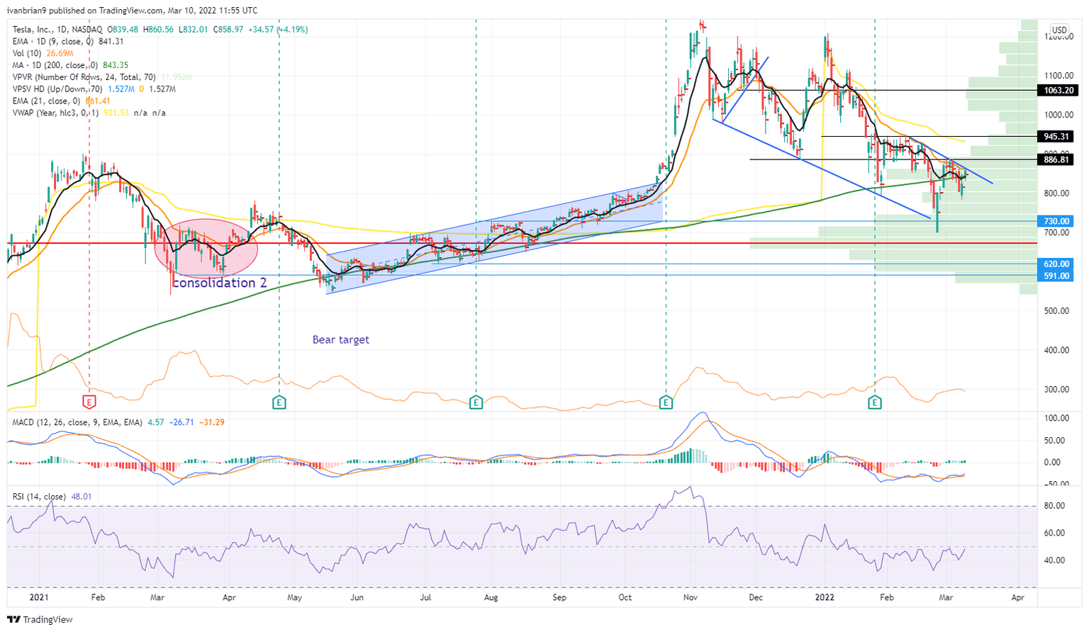 The rally on Wednesday was impressive but has only brought TSLA stock back up to the top trendline. The stock is still in a bearish formation and is trading just around its 200-day moving average. A move back below the 200-day will bring the spike low from the start of the Ukraine conflict into focus. This is at $700.