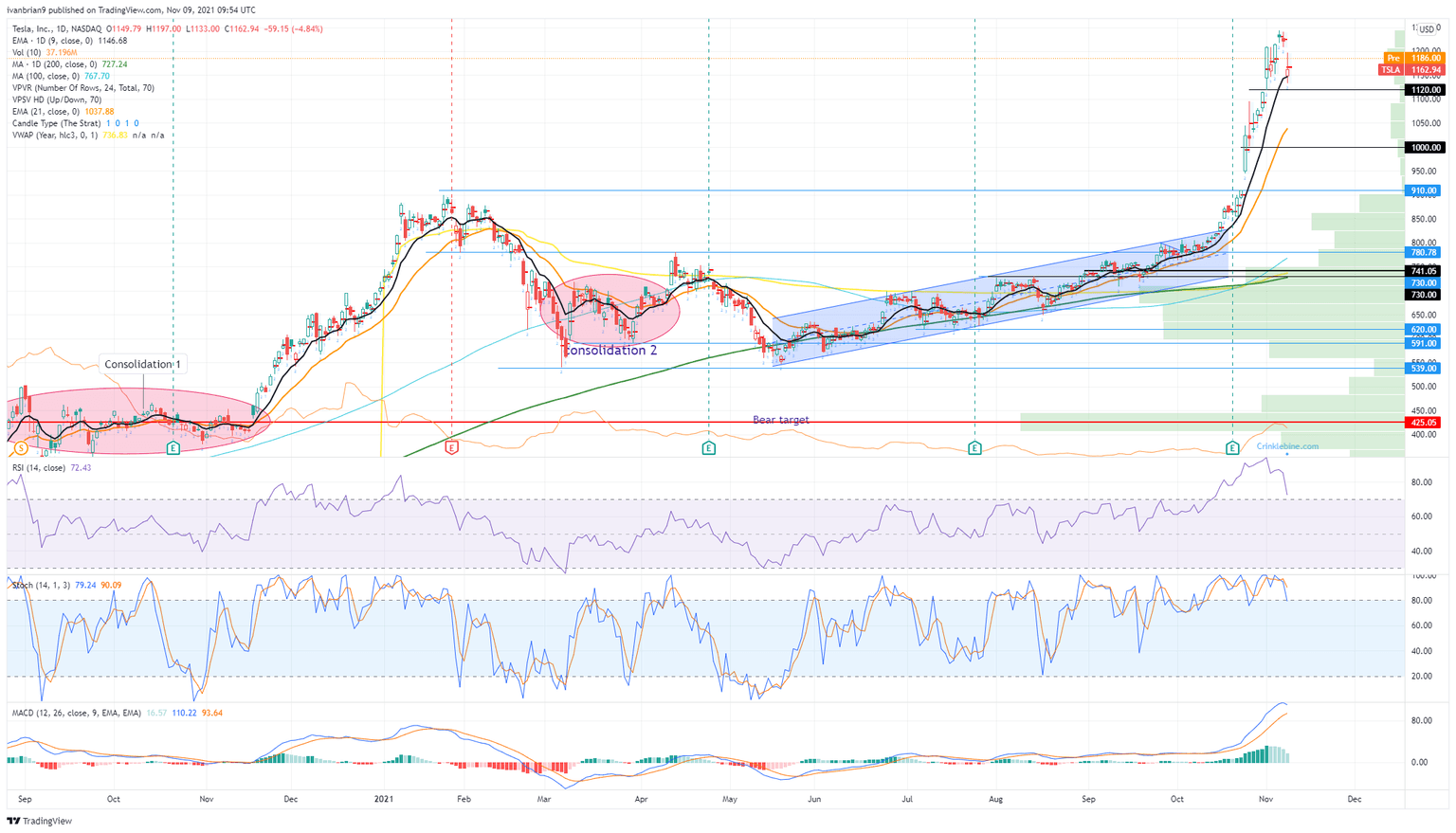 - Tesla has been showing up as overbought since breaking above $1,000.