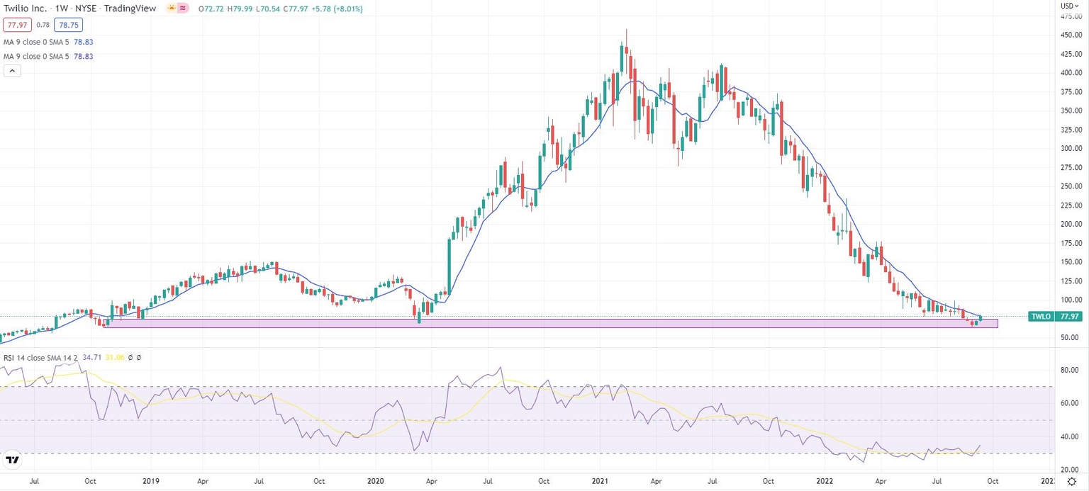 Additionally, there is a divergence between the Relative Strength Index (RSI) and the weekly price chart below. Since about March Twilio stock has been experiencing lower lows. However, at the same time on the RSI it was experiencing higher lows. This divergence pattery typically signals a reversal.